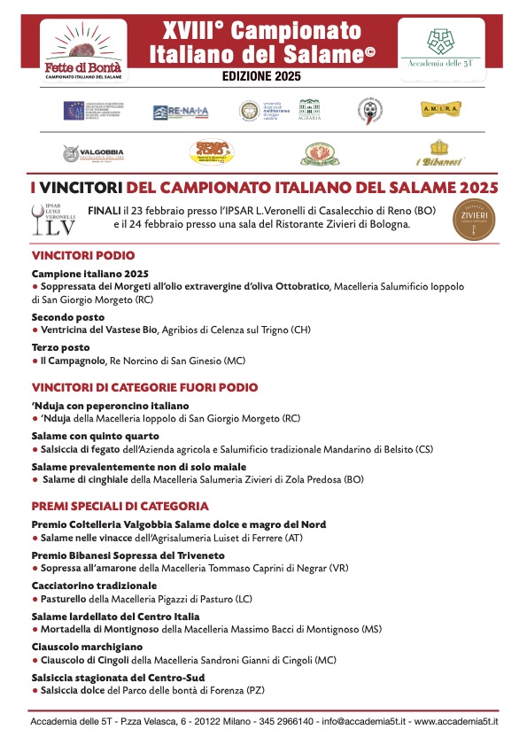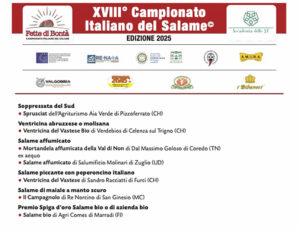 Il Campionato italiano del salame 2025, dopo le semifinali dell’anno scorso che hanno selezionato quasi 60 salami di 13 diverse regioni, è giunto al traguardo con l’assegnazione del podio e di premi di categoria.