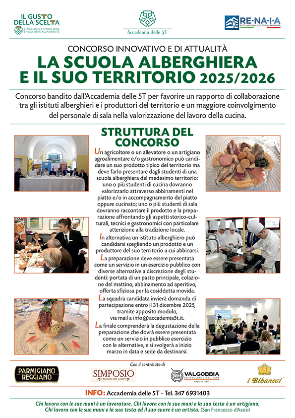 L’Accademia delle 5T bandisce un concorso per favorire un rapporto di collaborazione tra gli istituti alberghieri e i produttori del territorio e un maggiore coinvolgimento del personale di sala nella valorizzazione del lavoro della cucina.