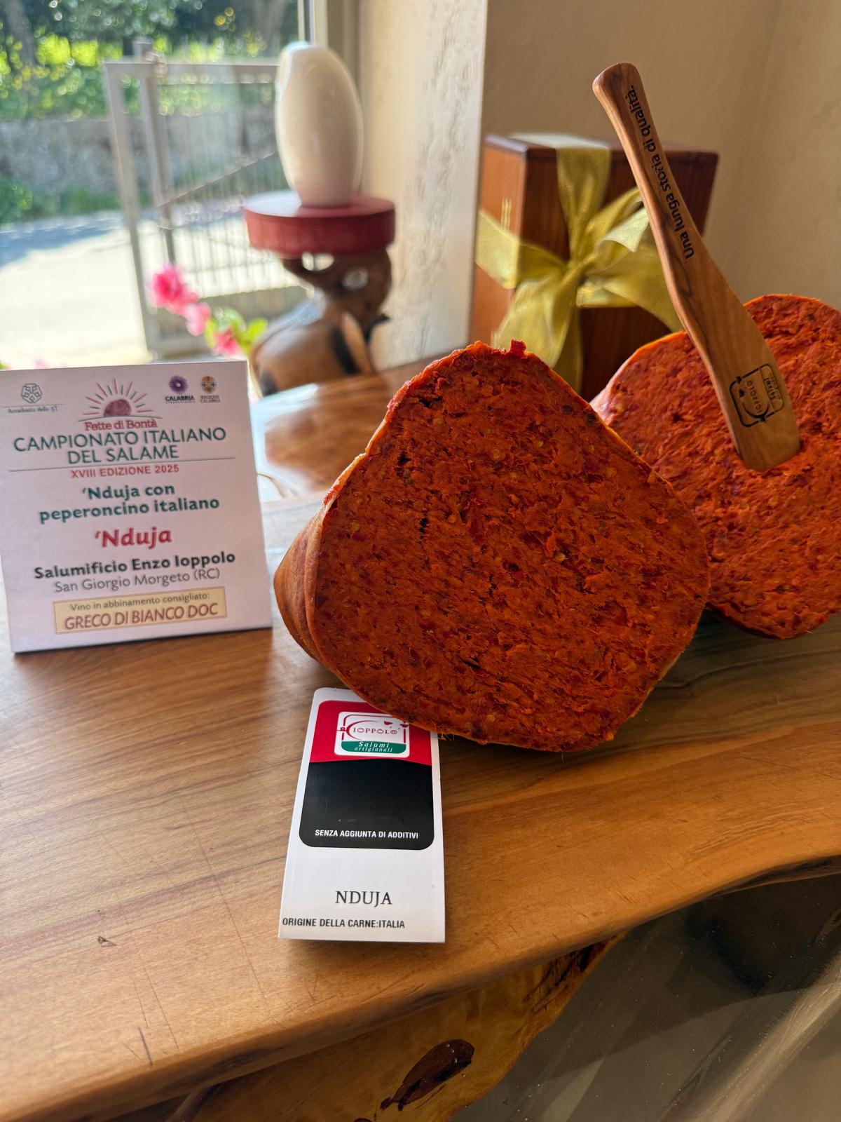 La ‘Nduja della famiglia Ioppolo ha vinto anche il premio speciale dedicato a questa tipicità calabrese che oggi sta avendo un grande successo internazionale. L’abbinamento suggerito è con un vino passito, Il Greco di Bianco Doc.