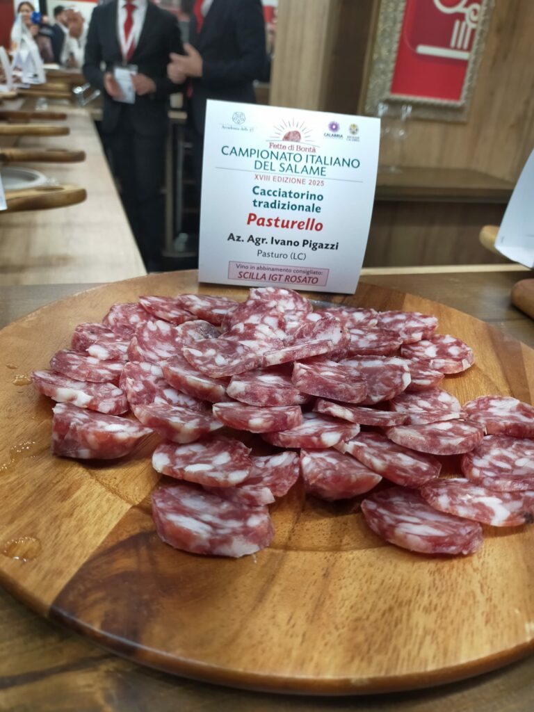 Si chiama Pasturello ed è uno dei salami di grande successo della piccola ma fecondissima macelleria di Ivano Pigazzi a Pasturo nel cuore della Valsassina (LC). Ma il nome non inganni, il Pasturello è semplicemente un salamino di quelli tradizionalmente chiamati cacciatorini, un eccellente e soprattutto autentico cacciatorino ma che non può chiamarsi col suo vero nome a causa dell’esistenza di una DOP demenziale, Salamini italiani alla cacciatora, il cui disciplinare nulla ha a che vedere con tipicità e tradizione. Ma l’Accademia delle 5T, sia per il gradimento da parte del pubblico per questa tipologia di salame sia proprio in polemica con l’abuso di una simile DOP su misura dell’industria più becera, se ne frega dei nomi commerciali e ha inserito tra le categorie dei premi speciali di categoria anche i Cacciatorini tradizionali prendendo in considerazione solo quelli che, nonostante nomi diversi, corrispondono alla tradizione.sia come caratteristiche organolettiche sia come territorialità.