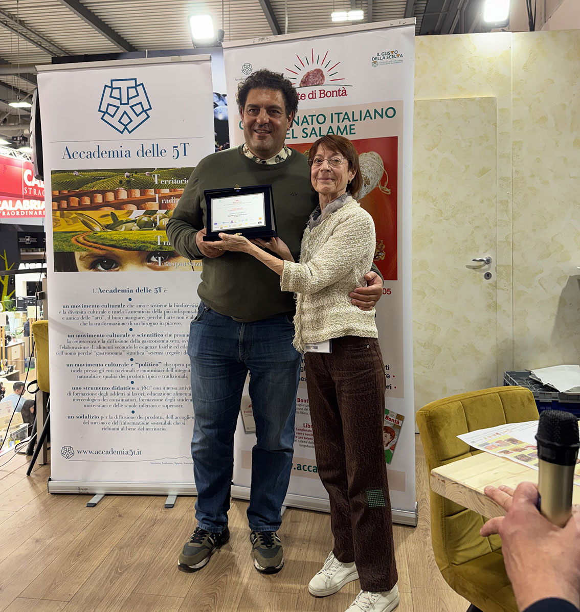 Maria Cristina Beretta, anima storica delle giurie del Campionato Italiano del Salame, consegna il premio a Stefano Zivieri presente a Vinitaly in rappresentanza della famiglia.