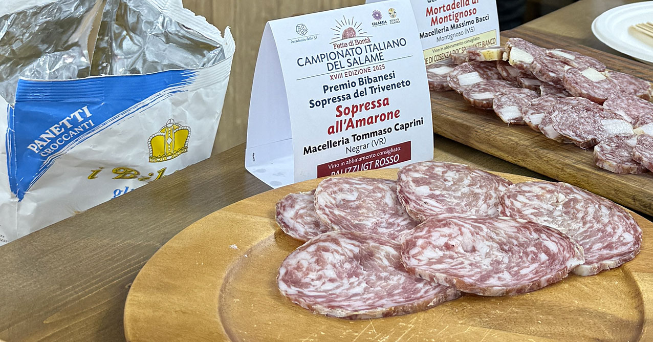 In basso: la Sopressa all’Amarone in degustazione dopo la premiazione al banco d’assaggio della Regione Calabria.