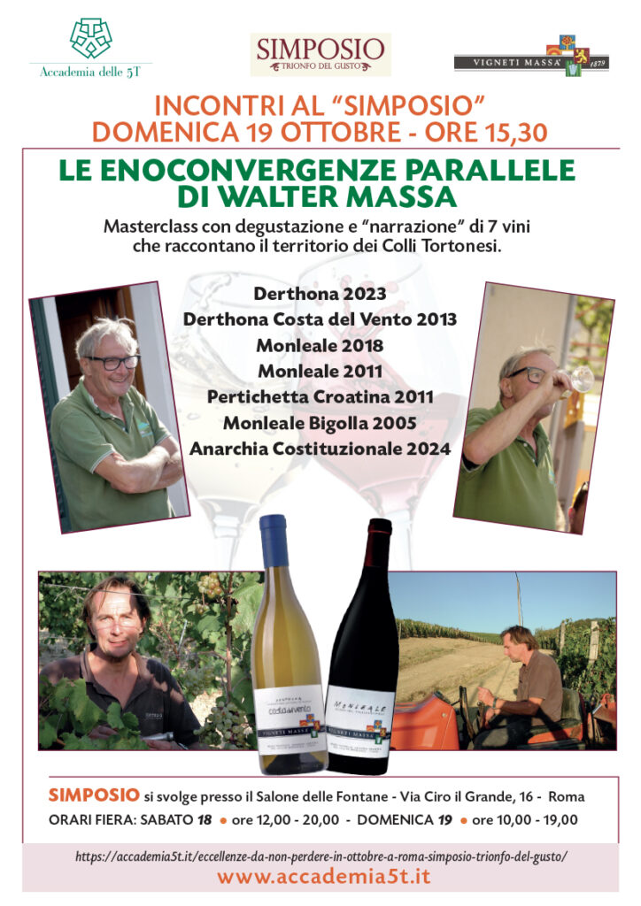 Masterclass “Le enoconvergenze parallele di Walter Massa” domenica 19 a Roma Home » Eventi A5T » Masterclass “Le enoconvergenze parallele di Walter Massa” domenica 19 a Roma PER PRENOTARE SCRIVERE A info@accademia5t.it Articoli collegati I candidati finalisti del concorso “Pane e salame ieri e oggi” 2025 Eccellenze da non perdere in ottobre a Roma: Simposio Trionfo del Gusto L’Italia e l’Europa agricola diverse anche negli obbiettivi della protesta SImposio Business a Roma, il primo evento per gli operatori del food del 2020 Un aiuto concreto al mondo del vino: aceti fatti e firmati dai vignaioli Divertente e… stimolante competizione tra barman al Simposio di Roma: il più buon cocktail piccante.